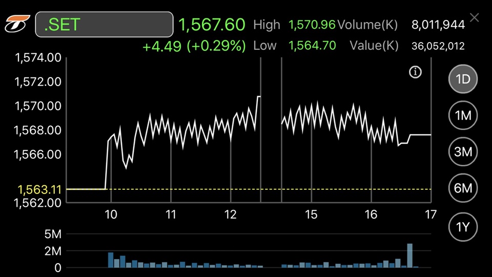 ผู้สื่อข่าวรายงานว่าดัชนีตลาดหลักทรัพย์ฯ ปิดที่ระดับ 1,567.60 จุด เพิ่มขึ้น 4.49 จุด หรือร้อยละ 0.29 มูลค่าการซื้อขาย 36,052.01 ล้านบาท โดยการซื้อขายหุ้นวันนี้ดัชนีหุ้นไทยเคลื่อนไหวแดนบวก แตะจุดสูงสุดที่ระดับ 1,570.96 จุด และต่ำสุดที่ระดับ 1,564.70 จุด