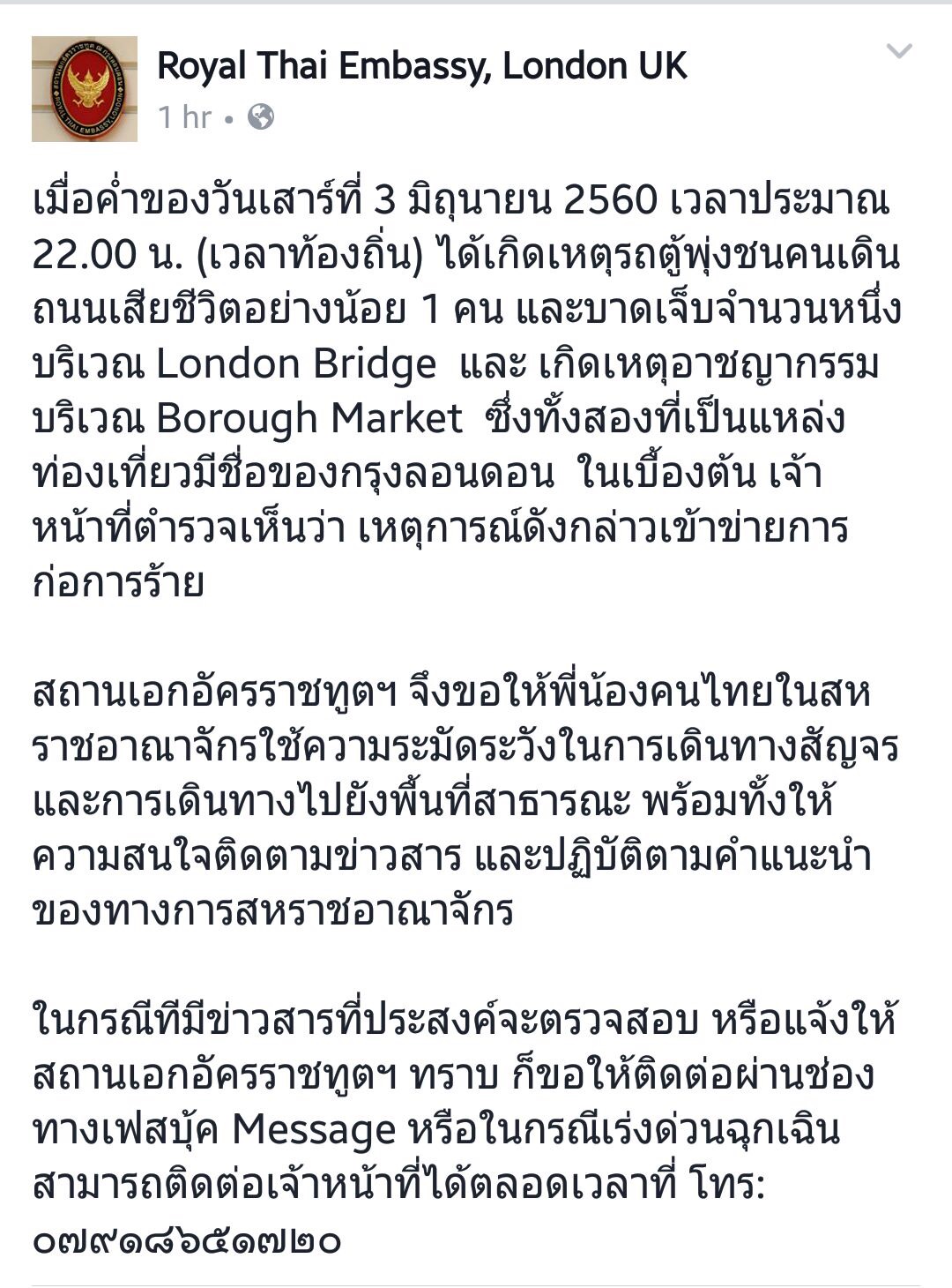 กรุงเทพ 4พ.ค.-สถานเอกอัครราชทูต ณ กรุงลอนดอน โพสต์ข้อความผ่านทางเฟสบุ๊ค ว่าเมื่อค่ำของวันเสาร์ที่ 3 มิถุนายน 2560 เวลาประมาณ 22.00 น. (เวลาท้องถิ่น) ได้เกิดเหตุรถตู้พุ่งชนคนเดินถนนเสียชีวิตอย่างน้อย 1 คน และบาดเจ็บจำนวนหนึ่ง บริเวณ “London Bridge” และ เกิดเหตุอาชญากรรมบริเวณ “Borough Market” ซึ่งทั้งสองที่เป็นแหล่งท่องเที่ยวมีชื่อของกรุงลอนดอน ในเบื้องต้น เจ้าหน้าที่ตำรวจเห็นว่า เหตุการณ์ดังกล่าวเข้าข่ายการก่อการร้าย
