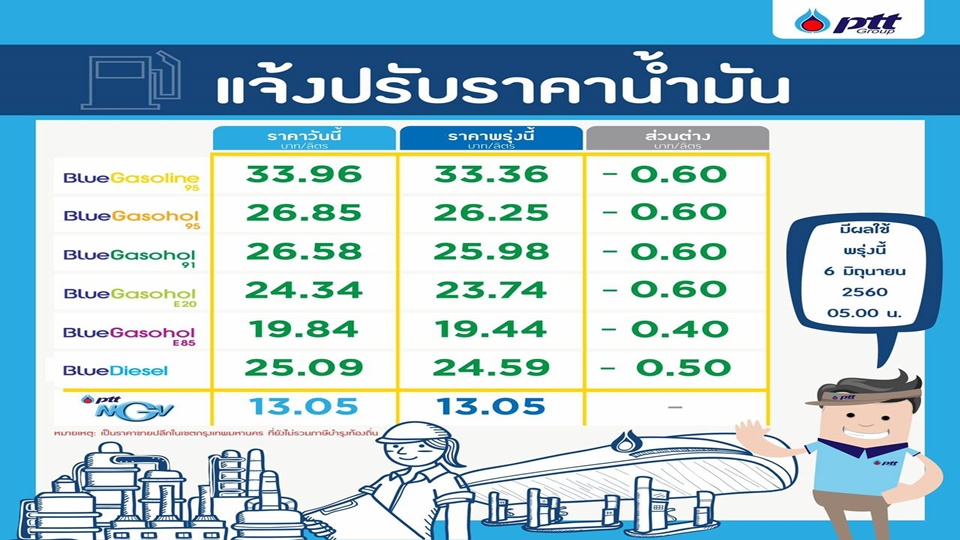 ผู้สื่อข่าวรายงานว่า บมจ.ปตท.และบางจากฯ ประกาศปรับลดราคาขายปลีกน้ำมันทุกชนิด 60 สตางค์ต่อลิตร ยกเว้น E85 ลด 40 สตางค์ และดีเซลลด 50 สตางค์ มีผลวันที่ 6 มิถุนายน เวลา 05.00 น. เป็นต้นไป โดยราคาขายปลีกเป็นดังนี้ เบนซิน 95 อยู่ที่ 33.36 บาท แก๊สโซฮอล์ 95 อยู่ที่ 26.25 บาท E20 อยู่ที่ 23.74 บาท แก๊สโซฮอล์ 91อยู่ที่ 25.98 E85 อยู่ที่ 19.44บาท และดีเซล 24.59 บาทต่อลิตร โดยราคาขายปลีกข้างต้นยังไม่รวมภาษีบำรุงกรุงเทพมหานคร.-สำนักข่าวไทย