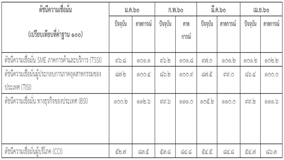 สำหรับดัชนีคาดการณ์ 3 เดือนข้างหน้าปรับตัวเพิ่มขึ้นจากระดับ 101.2 ในเดือนมีนาคม 2560 เป็นที่ระดับ 102.2 ในเดือนเมษายน 2560 แสดงให้เห็นว่าผู้ประกอบการมีความเชื่อมั่นในทิศทางอนาคต