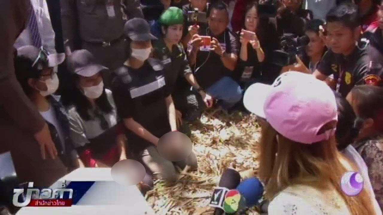 ขอนแก่น 5 มิ.ย.-น.ส.ปรียานุช โนนวังชัย หรือเปรี้ยว น.ส.กวิตา ราชดา หรือ เอิร์น และน.ส.อภิวันทน์ สัตยบัณฑิต หรือแจ้ 3 ผู้ต้องหาร่วมกันฆ่าหั่นศพน้องแอ๋ม วริศรา กลิ่นจุ้ย ยกมือไหว้ขอขมาญาติของผู้ตาย ในจุดทำแผนประกอบคำรับสารภาพบ้านโนนสง่า อ.เขาสวนกวาง จ.ขอนแก่น ซึ่งกลุ่มผู้ต้องหานำร่างที่หั่น 2 ท่อน ห่อด้วยถุงดำยัดเข้าไปในถังและใช้เสียมขุดดินฝังทำลายหลักฐาน ขณะขอขมาเอิร์นได้หลั่งน้ำตาออกมา โดยในพื้นที่บ้านโนนสง่า ยังเป็นจุดที่ทิ้งเลื่อยที่ใช้หั่นศพด้วย