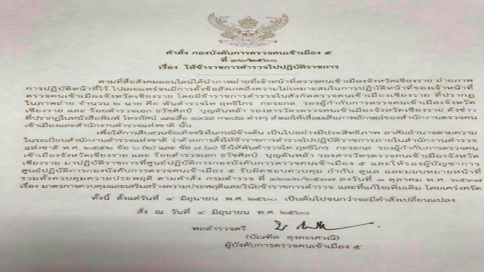 ล่าสุด พล.ต.ต.บัณฑิต ตุงคะเศรณี ผบก.ตม.5 ได้ส่งสำเนาคำสั่งมายังนายตำรวจระดับสูงของสำนักงานตำรวจแห่งชาติเพื่อแจ้งให้ทราบว่าได้ลงนามในคำสั่งที่ 36/2560 ลงวันที่ 4 มิ.ย.2560 ให้ พ.ต.ท.ฤทธิไกร กะระกล รองผู้กำกับการตรวจคนเข้าเมือง จังหวัดเชียงราย และ ร.ต.อ.ธวัชศิลป์ บุญตันหล้า รองสารวัตรตรวจคนเข้าเมืองจังหวัดเชียงราย ไปปฏิบัติราชการที่ศูนย์ปฏิบัติการตรวจคนเข้าเมือง 5 ( ศปก.ตม.5 )เพื่อให้การสืบสวนข้อเท็จจริงเป็นไปอย่างมีประสิทธิภาพ พร้อมระบุถึงเหตุผลว่า การปฏิบัติหน้าที่ดังกล่าวส่งผลเสียต่อภาพลักษณ์ของสำนักงานตรวจคนเข้าเมืองและสำนักงานตำรวจแห่งชาติ