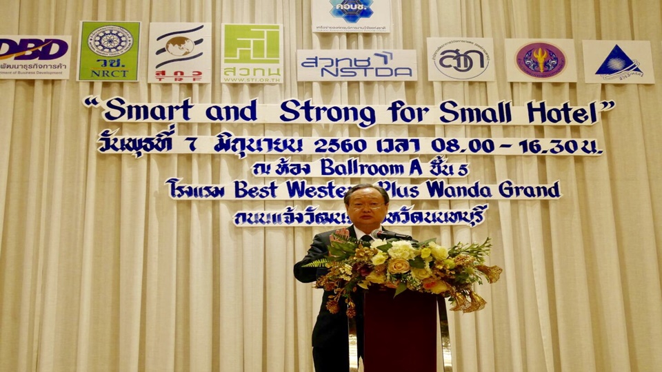 นายสนธิรัตน์ สนธิจิรวงศ์ รัฐมนตรีช่วยว่าการกระทรวงพาณิชย์ กล่าวเปิดงานและปาฐกถาพิเศษ เรื่อง “ทิศทางการขับเคลื่อนธุรกิจบริการกับเศรษฐกิจฐานรากมุ่งสู่ SME 4.0” โดยระบุว่าโครงการ Smart and Strong for Small Hotel เกิดขึ้น เพื่อพัฒนาศักยภาพการประกอบธุรกิจโรงแรมขนาดเล็กในยุคเศรษฐกิจดิจิทัลที่จะต้องได้รับการพัฒนาและขยายฐานเครือข่ายคลัสเตอร์โรงแรมขนาดเล็กให้มีความเข้มแข็ง รองรับตลาดการท่องเที่ยวใหญ่ของประเทศนำร่องภาคเหนือ โดยเชื่อมโยงเครือข่ายจับคู่ธุรกิจผ่านระบบออนไลน์ http://matching.smartthaibiz.com ทำให้สามารถเชื่อมโยงกันได้ทุกสถานที่และทุกเวลา โดยขณะนี้มีเอสเอ็มอีในระบบประมาณ 3,000 ราย สร้างโอกาสธุรกิจเชื่อมการให้บริการครบวงจรและเพิ่มเส้นทางท่องเที่ยวรองรับนักท่องเที่ยวทั้งชาวไทยและชาวต่างชาติที่ต้องการเข้าถึงแหล่งท่องเที่ยวเชิงวัฒนธรรมและชุมชนมากขึ้น