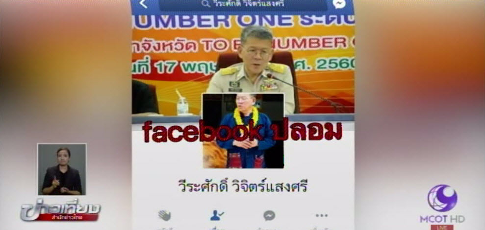 นี่คือเฟซบุ๊กปลอมที่อ้างชื่อเป็นนายวีรศักดิ์ วิจิตร์แสงศรี ผู้ว่าฯ พิจิตร แต่ถ้าสังเกตจะเห็นว่าชื่อนายวีรศักดิ์ มีสระอะ อยู่ตรง ร.เรือ แต่ชื่อของผู้ว่าราชการจังหวัดพิจิตรไม่มีสระอะ