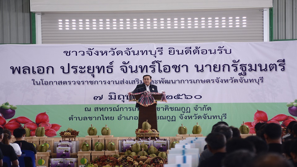 นายกรัฐมนตรี กล่าวกับประชาชนว่า การลงพื้นที่ครั้งนี้เพื่อยืนยันความตั้งใจของรัฐบาลในการดูแลประชาชนทุกกลุ่มด้วยการจัดสรรงบประมาณสร้างความเข้มแข็งทุกจังหวัด โดยให้ความสำคัญกับการพัฒนาและเสริมสร้างความเข้มแข็งให้กับเกษตรกร โดยในพื้นที่จังหวัดจันทบุรี ถือว่ามีความสำคัญและมีศักยภาพ เพราะมีความอุดมสมบูรณ์และความหลากหลายของผลผลิตทางการเกษตร ให้เกิดรูปแบบการเกษตรแปลงใหญ่ที่มีประสิทธิภาพในการบริหารจัดการผลผลิตทางการเกษตร