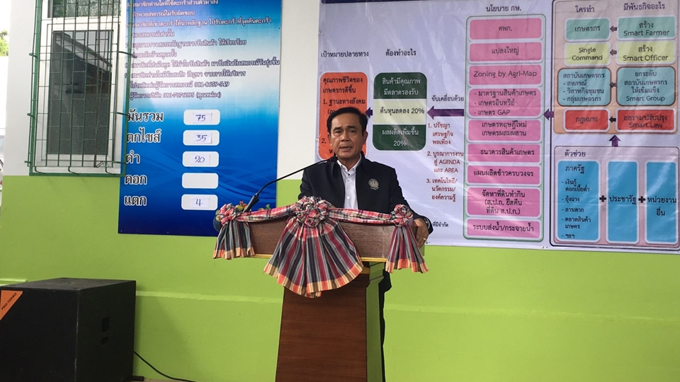 “รัฐบาลได้นำศาสตร์พระราชาและปรัญชาเศรษฐกิจพอเพียง ของพระบาทสมเด็จพระปรมินทรมหาภูมิพลอดุลยเดช และพระบรมราโชวาทของสมเด็จพระเจ้าอยู่หัว ที่ทรงรับสั่งให้มีเป้าหมายในการทำงาน และเตรียมแผนเผชิญเหตุเพื่อลดความเสี่ยง มาใช้ในการแก้ปัญหาและพัฒนาการเกษตรในทุกขั้นตอน เชื่อมโยงทั้งห่วงโซ่ ทั้งนี้เกษตรกรมีความต้องการที่แตกต่างกัน รัฐบาลไม่สามารถตอบสนองได้ทุกความต้องการ จึงขอให้รวมกลุ่มเป็นเกษตรแปลงใหญ่ หากขาดสิ่งใด รัฐบาลจะเติมเต็มให้ และขอให้สร้างแรงบันดาลใจให้ผู้บริโภคว่าไม่ว่าผลไม้จะลูกเล็กหรือใหญ่ ก็อร่อยเหมือนกันหมด พร้อมใช้เทคโนโลยีพัฒนาผลผลิตให้ดีขึ้น” นายกรัฐมนตรี กล่าว
