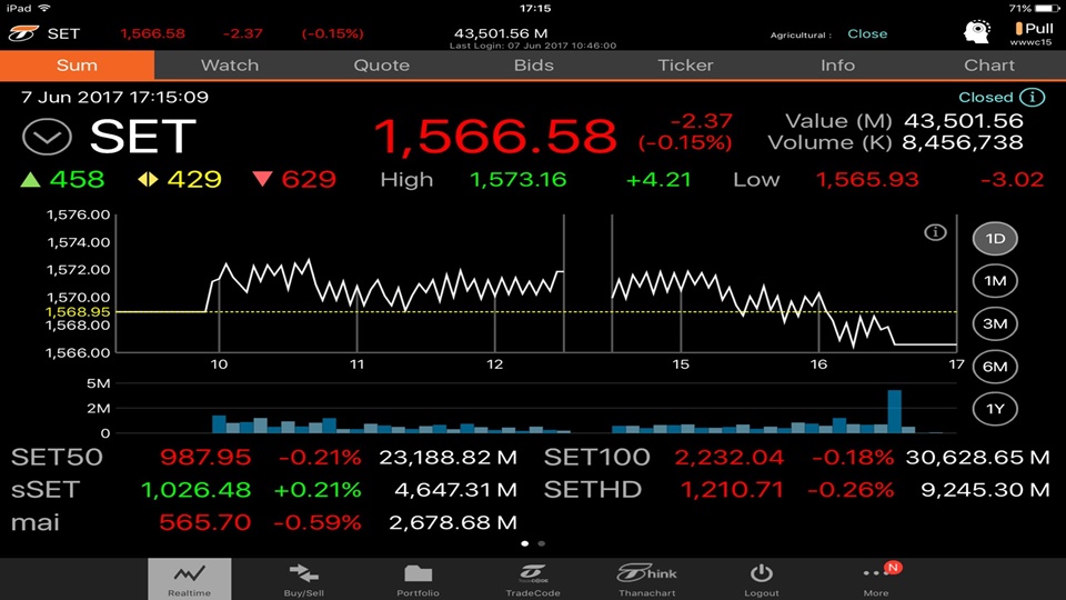 ผู้สื่อข่าวรายงานว่าวันนี้ (7 มิ.ย.) ดัชนีตลาดหุ้นไทยปิดการซื้อขายที่ระดับ 1,566.58 จุด ลดลง 2.37 จุด หรือร้อยละ 0.15 มูลค่าการซื้อขายรวม 43,501.56 ล้านบาท โดยการเคลื่อนไหวดัชนีอยู่ทั้งแดนบวกและลบ ปรับตัวสูงสุดของวันที่ระดับ 1,573.16 จุด และต่ำสุดของวันที่ 1,565.93 จุด