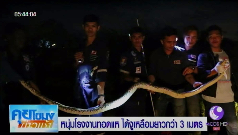 ชลบุรี 8 มิ.ย. – หนุ่มโรงงานชลบุรีทอดแหหาปลา ตกใจเจองูเหลือมขนาดใหญ่ ยาวกว่า 3 เมตร แจ้งเจ้าหน้าที่กู้ภัยมาจับปล่อยคืนสู่ธรรมชาติ