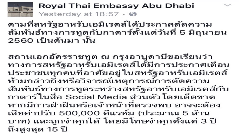 สถานเอกอัครราชทูตไทย ณ กรุงอาบูดาบี ประเทศสหรัฐอาหรับเอมิเรตส์ (ยูเออี) โพสต์ข้อความผ่านทางเฟซบุ๊คของสถานทูตฯ โดยระบุถึงกรณีที่หลายประเทศในภูมิภาคตะวันออกกลาง ซึ่งรวมถึงยูเออีตัดความสัมพันธ์ทางการทูตกับประเทศกาตาร์ ว่า ทางการสหรัฐอาหรับเอมิเรตส์ได้ประกาศเตือนประชาชนทุกคนที่อาศัยอยู่ในสหรัฐอาหรับเอมิเรตส์ ห้ามกล่าวถึงหรือวิจารณ์เหตุการณ์การตัดความสัมพันธ์ทางการทูตระหว่างยูเออีกับกาตาร์ในสื่อโซเชียลส่วนตัวโดยเด็ดขาด