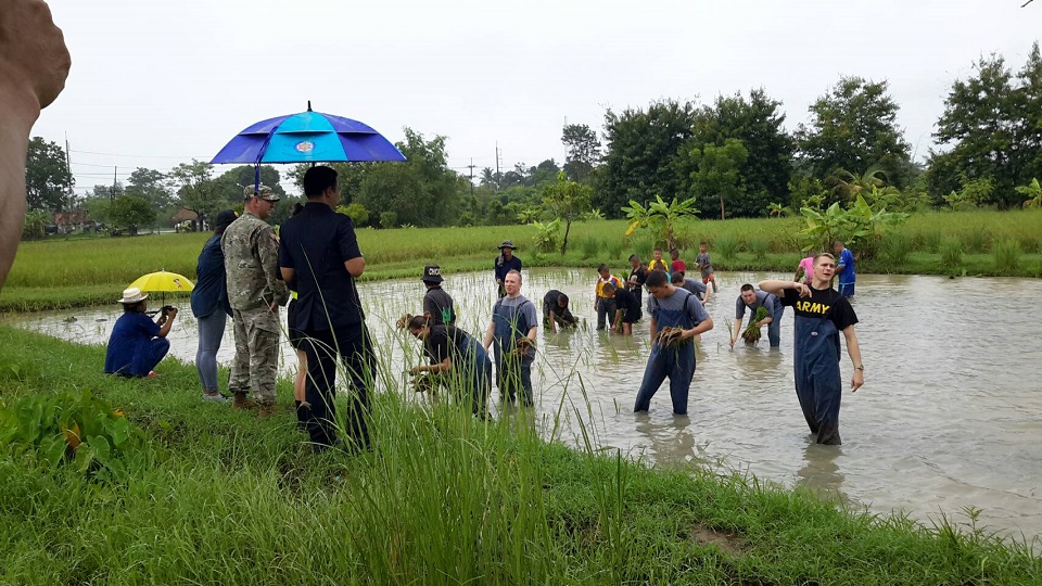 พ.ท.สมศักดิ์ เทศขำ ผู้บังคับหน่วยช่างพัฒนา หน่วยพัฒนาการเคลื่อนที่ 12 (นพค.12) นำคณะนักเรียนนายทหารบัตรศาสตร์สหรัฐอเมริกา จำนวน 11 นาย ชาย 7 คน หญิง 4 คน ตามโครงการความร่วมมือด้านวัฒนธรรมและความเป็นผู้นำประเทศ เดินทางมาศึกษาวัฒนธรรมประเพณีและวิถีชีวิตเกษตรกร ที่โรงเรียนกาสรกสิวิทย์ อ.เมือง จ.สระแก้ว โดยเรียนรู้และฝึกปฏิบัติการทำนา ตั้งแต่การไถนา ปักดำต้นกล้า การนั่งบนหลังกระบือ รวมถึงการละเล่นของไทย เช่น เดินกะลา เดินขาโถกเถก โดยมีนักเรียนจากโรงเรียนบ้านหนองหว้าสาธิต และร่วมเรียนรู้กับนักเรียนนายทหารสหรัฐฯ ในครั้งนี้ จากนั้นไปดูตามฐานต่าง ๆ เช่น อุปกรณ์ในการทำนา อุปกรณ์จับสัตว์น้ำสมัยเก่า การทำปุ๋ยชีวภาพ การทำก๊าซชีวภาพจากมูลสัตว์ โดยสาธิตโดยการทอดไข่ การทำบ้านดิน ท่ามกลางสายฝนโปรยปรายมาตลอดเวลา