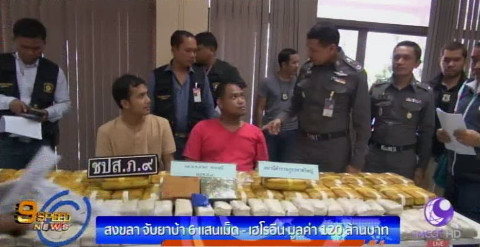 สงขลา 10 มิ.ย. – ผู้บัญชาการตำรวจภูธรภาค 9 แถลงผลจับกุมนายไกรทอง เพ็ชรมี ชาวจังหวัดสุโขทัย และนายอธิวัฒน์ เฉลิมไทย ชาวจังหวัดนครสวรรค์ พร้อมยาบ้า 600,000 เม็ด และเฮโรอีน 756 กรัม มูลค่ารวม 120 ล้านบาท ขณะทั้ง 2 คน ขับรถกระบะทะเบียนกรุงเทพฯ มาจอดรอส่งสินค้าให้ลูกค้าใน อ.หาดใหญ่ บริเวณริมถนนสายเอเชีย สี่แยกสนามบิน ต.ควนลัง อ.หาดใหญ่ จ.สงขลา โดยซุกซ่อนมาในล้อยางรถ สารภาพลำเลียงยาบ้าและเฮโรอีน จากริมแม่น้ำโขง ชายแดน จ.หนองคาย เพื่อส่งต่อให้เครือข่ายยาเสพติดในจังหวัดชายแดนภาคใต้ ได้ค่าจ้างคนละ 50,000 บาท/ครั้ง ทำมาแล้ว 5 ครั้ง. – สำนักข่าวไทย