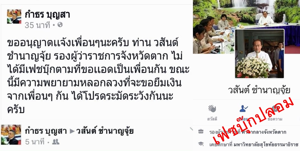 ผู้สื่อข่าวรายงานจาก จ.ตาก ว่า ขณะนี้มีหัวหน้าส่วนราชการ ผู้นำท้องถิ่น พ่อค้า ประชาชนในจังหวัดตาก ถูกผู้ใช้เฟซบุ๊กอ้างชื่อว่า วสันต์ ชำนาญจุ้ย รองผู้ว่าราชการจังหวัดตาก ส่งข้อความขอเป็นเพื่อนในเฟซบุ๊ก แล้วส่งแชทข้อความขอยืมเงินตั้งแต่ 30,000 บาท โดยอ้างว่าพี่สาวซึ่งอยู่ที่จังหวัดสุพรรณบุรีเสียชีวิต ต้องรีบกลับไปจัดงานศพ แล้วยังต้องรีบเดินทางกลับมาจังหวัดตาก เนื่องจากมีประชุมด่วน จึงขอรบกวนให้โอนเงินมาให้ 30,000-40,000 บาท เพื่อส่งให้ทางบ้านใช้ซื้อของจัดงานศพก่อนที่นายวสันต์จะเดินทางไปถึง พร้อมกับให้เลขบัญชีอ้างว่าเป็นของพี่สาว ชื่อบัญชี วรณัน แสวงกำไร เลขบัญชี 938-0233-651 ธนาคารกรุงเทพ