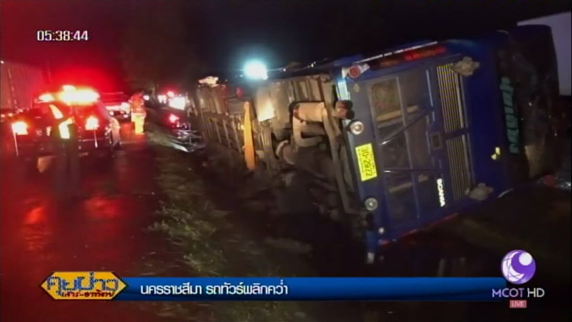 นครราชสีมา 11 มิ.ย.-เกิดเหตุรถทัวร์คณะผู้ใหญ่บ้าน-อบต.หนองโลง จ.สระบุรี ที่กลับจากศึกษาดูงานที่ จ.หนองคาย เสียหลักพลิกคว่ำตกร่องกลางถนนที่ จ.นครราชสีมา บาดเจ็บรวม 35 ราย สาหัส 3 ราย