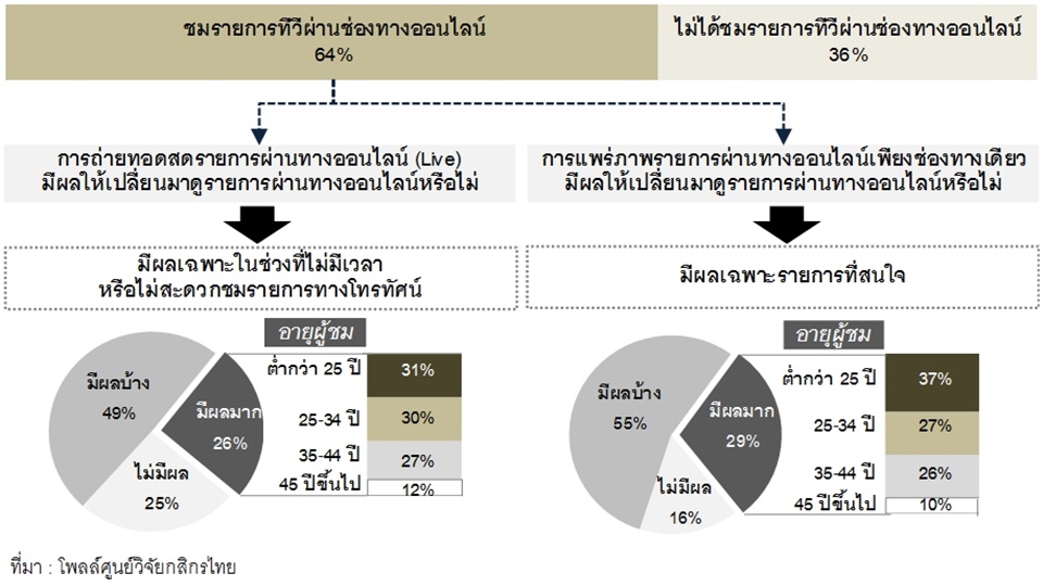 ทั้งนี้ จากการสำรวจพฤติกรรมการชมรายการทีวีผ่านช่องทางออนไลน์ ระหว่างวันที่ 1-22 พฤษภาคม 2560 พบว่ากลุ่มตัวอย่างส่วนใหญ่ร้อยละ 64 ชมรายการทีวีผ่านช่องทางออนไลน์ ขณะที่กลุ่มตัวอย่างอีกร้อยละ 36 ไม่ได้ชมรายการทีวีผ่านช่องทางออนไลน์ โดยกลุ่มตัวอย่างที่ชมรายการทีวีผ่านช่องทางออนไลน์ส่วนใหญ่ร้อยละ 49 ระบุว่าการถ่ายทอดสดรายการทีวีผ่านช่องทางออนไลน์ (Live) มีผลให้เปลี่ยนพฤติกรรมการดูรายการทีวี นอกจากนี้ กลุ่มตัวอย่างที่ชมรายการทีวีผ่านช่องทางออนไลน์ส่วนใหญ่ร้อยละ 55 ระบุว่าการแพร่ภาพรายการทีวีผ่านช่องทางออนไลน์เพียงช่องทางเดียว โดยไม่แพร่ภาพผ่านโทรทัศน์มีผลให้เปลี่ยนพฤติกรรมการดูรายการทีวี จากการดูผ่านโทรทัศน์เป็นหลักมาสู่การดูผ่านช่องทางออนไลน์บ้างในบางครั้งเฉพาะรายการที่สนใจ