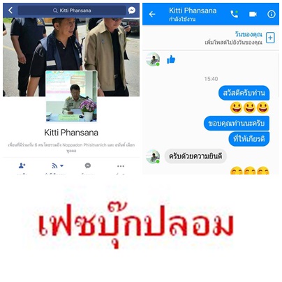 นายกิตติพันธุ์ ให้สัมภาษณ์ก่อนเดินทางไปประเทศเมียนมา เพื่อดูงานตามโครงการขับเคลื่อนยุทธศาสตร์ เตรียมความพร้อมเข้าสู่ประชาคมอาเซี่ยน ระหว่าง 12- 16 มิถุนายนว่า เพิ่งทราบเรื่องเช้ามืดและได้แจ้งให้ทราบแล้วว่าเฟซบุ๊กดังกล่าวเป็นของผู้แอบอ้างใช้ชื่อทำขึ้นเพื่อผลประโยชน์ จึงเกรงว่าจะมีผู้หลงเชื่อจึงมอบหมายให้เลขาหน้าห้องเข้าแจ้งความไว้ก่อน ขอย้ำว่าอย่าเชื่อเฟซบุ๊กปลอมดังกล่าวเด็ดขาด ซึ่งขณะนี้ได้ให้ตำรวจสืบสวนหาตัวผู้กระทำผิดมาดำเนินคดี และพอได้เบาะแสแล้ว.-สำนักข่าวไทย