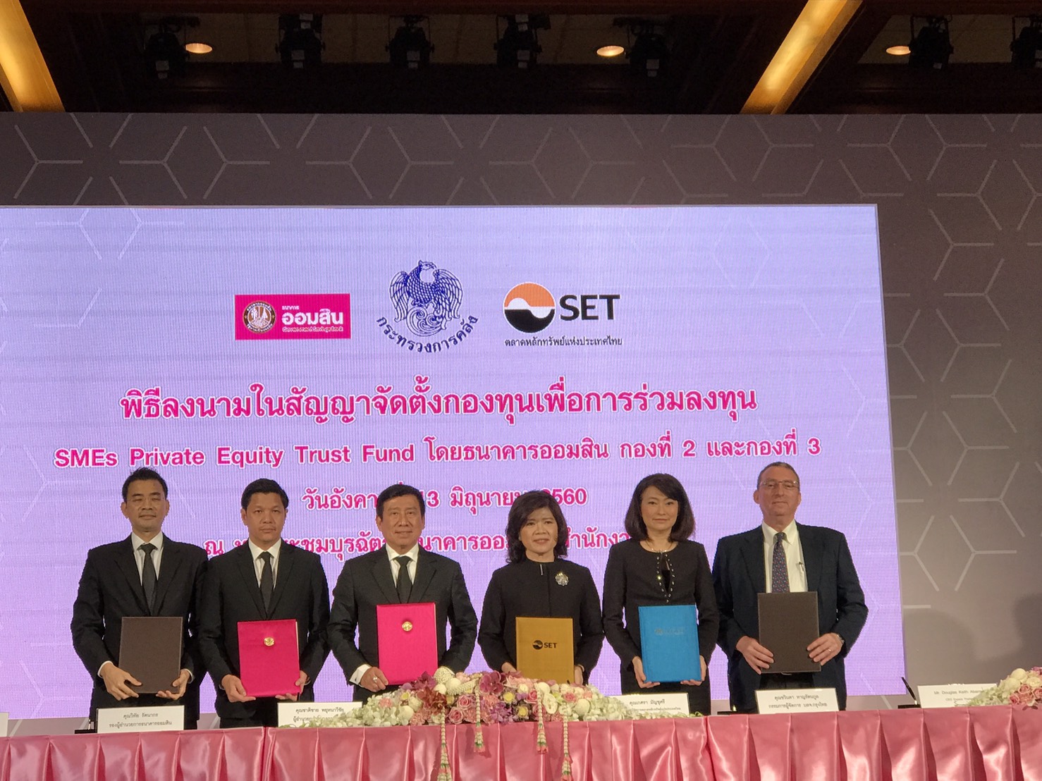 ตามที่กระทรวงการคลังได้มอบหมายให้ธนาคารออมสิน และ ตลาดหลักทรัพย์แห่งประเทศไทย จัดตั้งกองทุนร่วมลงทุน SMEs Private Equity Trust Fund วงเงินรวม 2,000 ล้านบาท และ มีการจัดตั้งกองทุนที่ 1 ไปเมื่อปีที่แล้ว 500 ล้านบาท วันนี้ได้มีพิธีลงนามในสัญญาจัดตั้งกองทุนร่วมลงทุน ฯ กองที่ 2 วงเงิน 500 ล้านบาท และ กองที่ 3 วงเงิน 1,000 ล้านบาท
