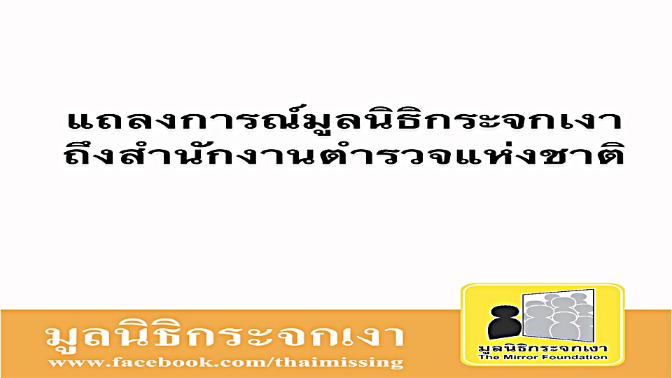 กรุงเทพฯ 13 เม.ย.- มูลนิธิกระจกเงา ออกแถลงการณ์เรียกร้อง สำนักงานตำรวจแห่งชาติ ยกระดับศูนย์บริหารจัดการคนหาย และประชาสัมพันธ์ย้ำแจ้งความคนหายทำได้ โดยไม่ต้องรอ 24 ชม.หลังเกิดกรณีพบศพหญิงลอยน้ำที่ จ.สมุทรปราการ แต่จนขณะนี้ยังไม่รู้ว่าเป็นใคร