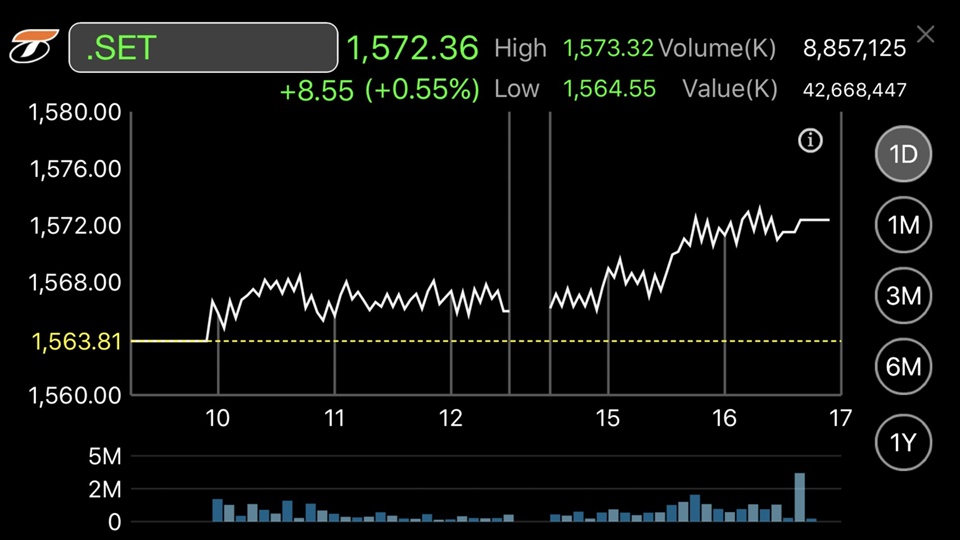ผู้สื่อข่าวรายงานว่าดัชนีตลาดหลักทรัพย์ฯ ปิดการซื้อขายวันนี้ที่ระดับ 1,572.36 จุด เพิ่มขึ้น 8.55 จุด หรือร้อยละ 0.55 มูลค่าการซื้อขาย 42,594.09 ล้านบาท โดยดัชนีวันนี้สดใสอยู่แดนบวกตลอดทั้งวัน สูงสุดของวันที่ระดับ 1,573.32 จุด และต่ำสุดที่ 1,564.55 จุด