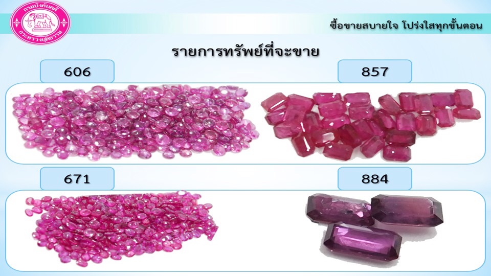 สำหรับสินทรัพย์ที่จะนำมาประมูล จะเป็นวัตถุคล้ายหยก ประมาณ 37.19 กะรัต และวัตถุคล้ายพลอยสีต่างๆ เช่น พลอยสีฟ้า สีเขียว สีเหลือง สีแดง สีดำ สีม่วง สีขาว เป็นลักษณะที่เจียระไนแล้ว รวมแล้วจำนวนกว่า 5,954 กะรัต และลักษณะเป็นก้อนรวมน้ำหนักภาชนะที่ใส่แล้วประมาณ 450 กิโลกรัม