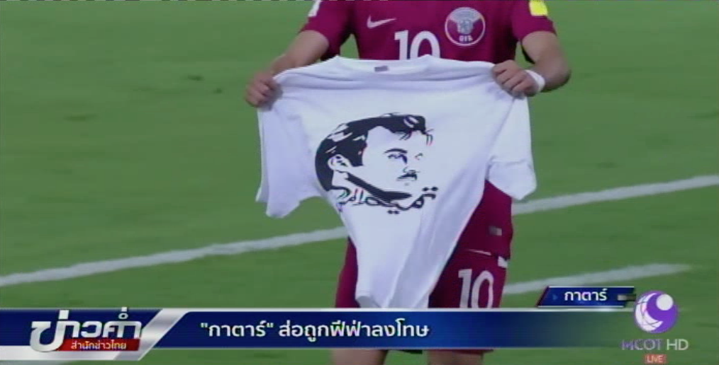 ความเคลื่อนไหวหลังเกมฟุตบอลโลก 2018 รอบคัดเลือก โซนเอเชีย นัดที่ 8 กลุ่มเอ กาตาร์ เปิดจัสซิม บิน ฮาเหม็ด สเตเดียม ในกรุงโดฮา เฉือนเอาชนะ เกาหลีใต้ 3-2 ล่าสุดทีมฟุตบอลชายกาตาร์ มีโอกาสสูงที่จะถูกสหพันธ์ฟุตบอลนานาชาติ หรือฟีฟ่า ลงโทษ หลังจากนักเตะกาตาร์ รวมถึง ฮัสซัน อัลเฮย์ดอส คนยิงประตูขึ้นนำในนัดนี้ สวมเสื้อยืดสีขาวที่มีรูปของเจ้าชายของกาตาร์ เพื่อเป็นสัญลักษณ์บ่งบอกถึงความไม่พอใจต่อนานาประเทศ โดยเฉพาะชาติอาหรับนำโดย ซาอุดีอาระเบีย, สหรัฐอาหรับเอมิเรตส์ และบาห์เรน ที่คว่ำบาตรตัดความสัมพันธ์กับกาตาร์ในทุกด้าน เนื่องจากรัฐบาลกาตาร์ ถูกกล่าวหาว่าให้การสนับสนุนผู้ก่อการร้าย สำหรับกฎของฟีฟ่า ห้ามมิให้แสดงข้อความหรือสัญลักษณ์ทางการเมือง การค้า หรือข้อความเกี่ยวกับศาสนาบนเสื้อของนักฟุตบอลทุกคน. -สำนักข่าวไทย