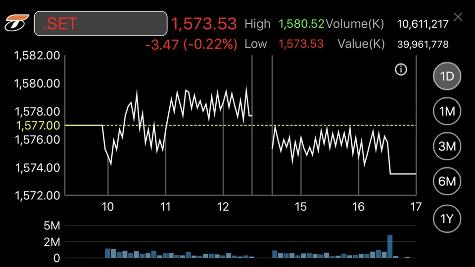 ผู้สื่อข่าวรายงานว่าดัชนีตลาดหลักทรัพย์ปิดช่วงบ่ายวันนี้ที่ระดับ 1,573.53 จุด ลดลง 3.47 จุด (-0.22%) มูลค่าการซื้อขาย 39,961.78 ล้านบาท โดยดัชนีหุ้นไทยเคลื่อนไหวแดนลบเป็นส่วนใหญ่ แตะจุดสูงสุดที่ 1,580.52 จุด และต่ำสุดที่ระดับ 1,573.53 จุด