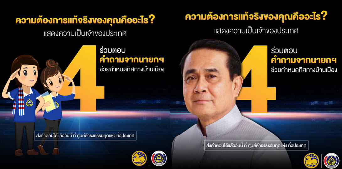 มหาดไทย 16 มิ.ย.- กรมการพัฒนาชุมชน โดยกระทรวงมหาดไทย ได้จัดกิจกรรมเชิญชวนประชาชนร่วมตอบคำถาม 4 ข้อ ของพล.อ.ประยุทธ์ จันทร์โอชา นายกรัฐมนตรี ที่ตลาดคลองผดุงกรุงเกษม ทำเนียบรัฐบาล โดยประสานให้เจ้าหน้าที่ศูนย์ดำรงธรรมมาอำนวยความสะดวก นอกจากนี้ ยังมีการจัดทำภาพอินโฟกราฟฟิค 2 ภาพ เพื่อเผยแพร่ โดยภาพแรกเป็นภาพของ พล.อ.ประยุทธ์ และอีกภาพเป็นตัวการ์ตูน ซึ่งทั้ง 2 ภาพระบุข้อความว่า “ความต้องการของคุณคืออะไร? แสดงความเป็นเจ้าของประเทศ ร่วมตอบคำถามจากนายกฯ ช่วยกำหนดทิศทางบ้านเมือง” .- สำนักข่าวไทย