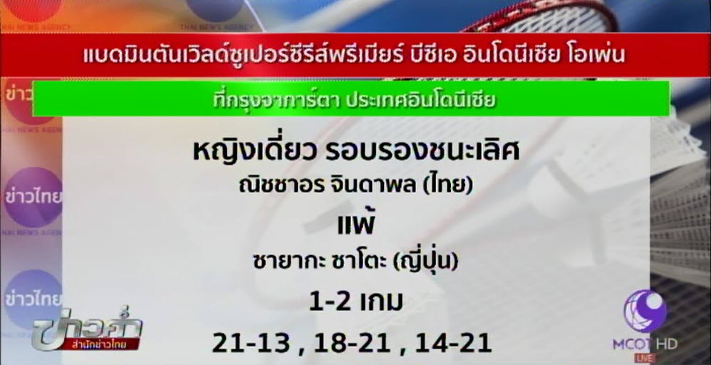 แบดมินตันเวิลด์ซูเปอร์ซีรีส์พรีเมียร์ บีซีเอ อินโดนีเซีย โอเพ่น ที่กรุงจาการ์ตา ประเทศอินโดนีเซีย หญิงเดี่ยว รอบรองชนะเลิศ “น้องแนท” ณิชชาอร จินดาพล นักแบดสาวไทยมือ 14 ของโลกที่สองรอบก่อนหน้านี้ ระเบิดฟอร์มตบเอาชนะ ไถ่ ซื่อ หยิง มือ 1 ของโลกจากไต้หวัน และไซน่า เนวาห์ล อดีตมือ 1 ของโลกจากอินเดีย ไปไม่ถึงดวงดาว หลังพลาดแพ้ให้กับ ซายากะ ซาโตะ มือ 17 ของโลกจากญี่ปุ่น 1-2 เกม 21-13, 18-21 และ 14-21 แม้ว่าในเกมที่ 3 จะกัดฟันสู้เนื่องจากกรำศึกหนักจนเป็นตะคริว พลาดเข้าไปลุ้นแชมป์อย่างน่าเสียดาย.-สำนักข่าวไทย