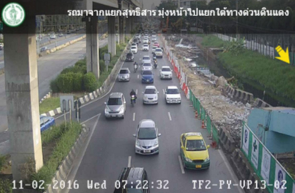 สภาพการจราจร ถนนวิภาวดีรังสิต ขาเข้า จากแยกสุทธิสาร มุ่งหน้าเข้าใต้ด่วนดินแดง รถมาก ท้ายชะลอตัวใกล้มหาวิทยาลัยหอการค้าไทย