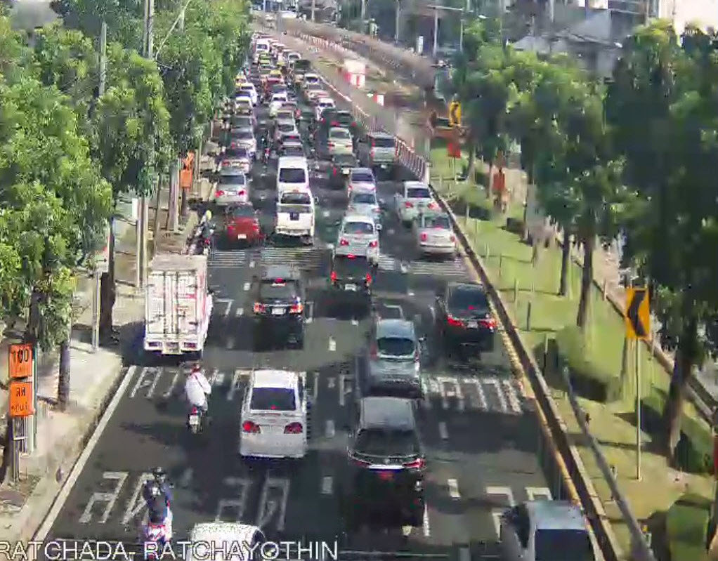 ถนนรัชดาภิเษก ขาออก จากแยกรัชดา-ลาดพร้าว มุ่งหน้าแยกรัชโยธิน รถมาก ท้ายสะสมตรงข้ามมหาวิทยาลัยราชภัฏจันทรเกษม