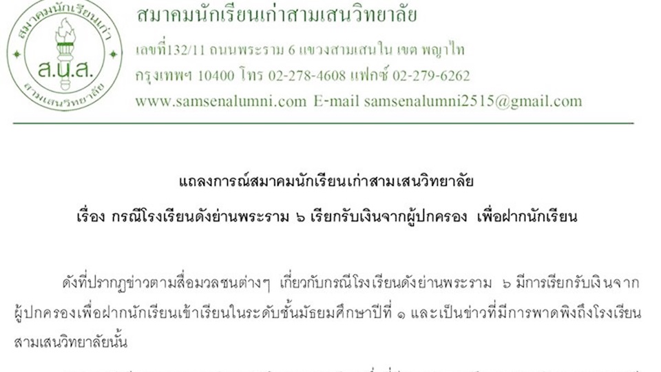 ดังที่ปรากฏข่าวตามสื่อมวลชนต่างๆ เกี่ยวกับกรณีโรงเรียนดังย่านพระราม 6 มีการเรียกรับเงินจากผู้ปกครองเพื่อฝากนักเรียนเข้าเรียนในระดับชั้นมัธยมศึกษาปีที่ 1และเป็นข่าวที่มีการพาดพิงถึงโรงเรียน สามเสนวิทยาลัยนั้น สมาคมนักเรียนเก่าสามเสนวิทยาลัย ในฐานะองค์กรหนึ่งที่มีวัตถุประสงค์ในการส่งเสริมความสามัคคี ผดุงเกียรติของนักเรียนเก่า สมาชิกสมาคมและโรงเรียนสามเสนวิทยาลัย รู้สึกไม่สบายใจอย่างยิ่งกับกรณีข่าวดังกล่าวที่เกิดขึ้น อันส่งผลกระทบต่อชื่อเสียงและเกียรติภูมิของโรงเรียนซึ่งเป็นสถาบันอันเป็นที่รักของนักเรียนเก่าสามเสนวิทยาลัยทุกคน