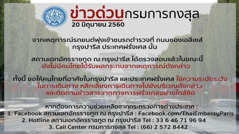 กรมการกงสุล กระทรวงต่างประเทศ ได้โพสต์ข้อความผ่านทางเฟซบุ๊ค เผยแพร่ช่องทางการให้ความช่วยเหลือคนไทยจากเหตุรถยนต์พุ่งเข้าชนรถตำรวจที่ถนนชองเอลิเซส์ กรุงปารีส ประเทศฝรั่งเศส โดยระบุว่า ล่าสุดสถานเอกอัครราชทูต ณ กรุงปารีส ได้ตรวจสอบแล้วขณะนี้ยังไม่มีคนไทยได้รับผลกระทบจากเหตุรถยนต์พุ่งเข้าชนรถตำรวจที่ถนนชอง เอลิเซส์ กรุงปารีส ประเทศฝรั่งเศส เมื่อวันที่ 19 มิถุนายน 2560 ตามเวลาท้องถิ่น ทั้งนี้ขอให้คนไทยที่อาศัยในกรุงปารีส และประเทศฝรั่งเศส ใช้ความระมัดระวังในการเดินทางหลีกเลี่ยงการเดินทางไปยังบริเวณดังกล่าว และติดตามข่าวสารจากทางการฝรั่งเศสอย่างใกล้ชิด หากต้องการความช่วยเหลือจากกระทรวงการต่างประเทศ สามารถติดต่อทางเฟซบุ๊กของสถานเอกอัครราชทูต ณ กรุงปารีส Facbook.com/ThaiEmbassyParis หรือฮอตไลน์สถานเอกอัครราชทูตฯ 33 6 46 71 96 94 หรือ คอลเซนเตอร์ กรมการกงสุล (66) 2 572 8442.-สำนักข่าวไทย