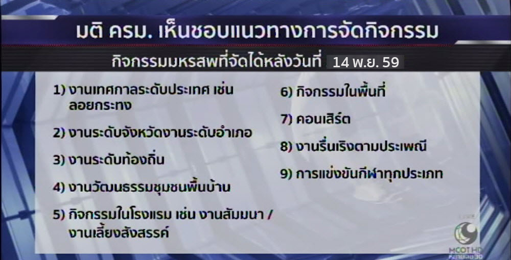 ขณะที่ผล ครม.ให้จัดกิจกรรมมหรสพหลังวันที่ 14 พฤศจิกายนนี้เป็นต้นไป ใน 9 ลักษณะ อาทิ งานเทศกาลระดับประเทศ เช่น ลอยกระทง งานระดับจังหวัด-อำเภอ-ท้องถิ่น กิจกรรมในโรงแรม เช่น งานสัมมนา, งานเลี้ยงสังสรรค์, คอนเสิร์ต และการแข่งขันกีฬาทุกประเภท