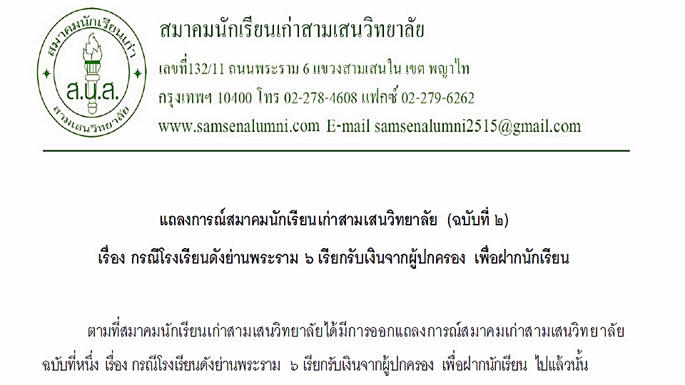 แถลงการณ์สมาคมนักเรียนเก่าสามเสนวิทยาลัย (ฉบับที่2) เรื่อง กรณีโรงเรียนดังย่านพระราม 6 เรียกรับเงินจากผู้ปกครอง เพื่อฝากนักเรียนโดยระบุว่า ตามที่สมาคมนักเรียนเก่าสามเสนวิทยาลัย ได้มีการออกแถลงการณ์สมาคมเก่าสามเสนวิทยาลัยฉบับที่หนึ่ง เรื่อง กรณีโรงเรียนดังย่านพระราม 6 เรียกรับเงินจากผู้ปกครอง เพื่อฝากนักเรียนไปแล้วนั้น