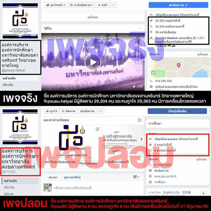 1. ไม่ใช่เพจทางการขององค์การนักศึกษาฯ (เฟซบุ๊กปลอม) จะเห็นได้จากข้อมูลและยอดผู้ติดตาม