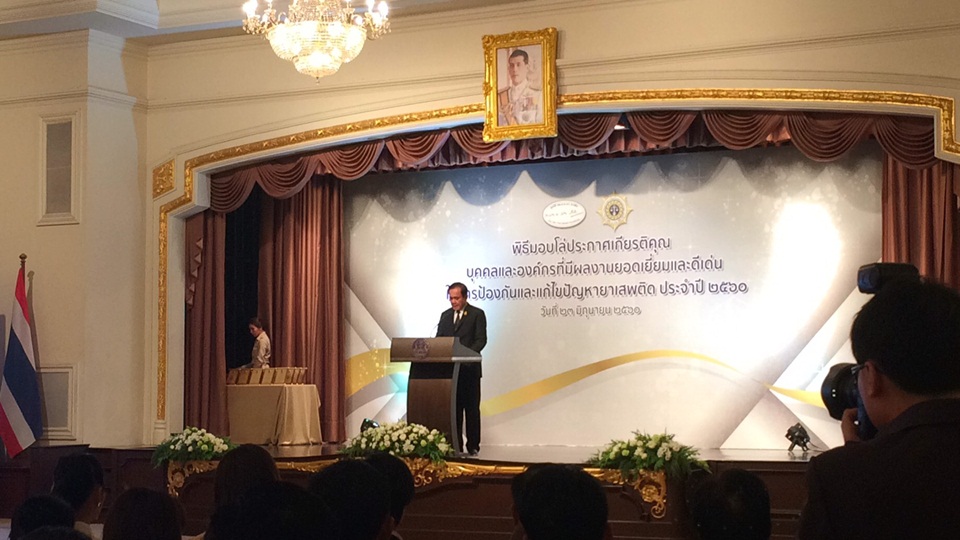 นายกรัฐมนตรี ได้กล่าวชื่นชมผู้ที่ได้รับรางวัล ขอให้มีความภาคภูมิใจในรางวัลที่ได้รับ เพราะถือเป็นรางวัลที่ทรงคุณค่า ขณะเดียวกันปัญหายาเสพติดถือว่าเป็นวาระแห่งชาติของรัฐบาลนี้ ในวันที่ 26 มิถุนายน เป็นวันยาเสพติดโลก และทั้งโลกตระหนักถึงปัญหายาเสพติดเช่นเดียวกับประเทศไทย ยอมรับว่าการจะปราบปรามให้หมดเป็นไปได้ยาก เพราะมีการพัฒนาการค้ายาขึ้นตามลำดับ รัฐบาลจึงต้องปรับการทำงานให้ทันและเดินหน้าในเชิงรุกในการป้องกันและปราบปราม ฟื้นฟูผู้เสพยา