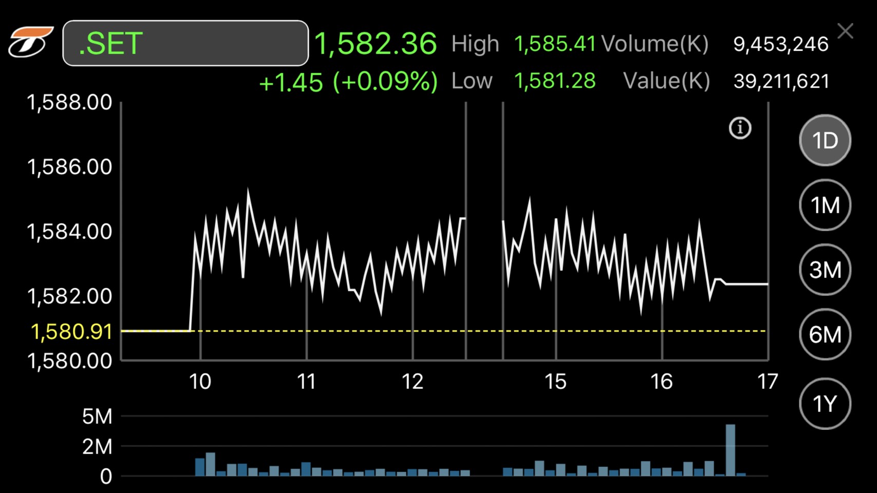ผู้สื่อข่าวรายงานว่าตลาดหุ้นไทยท้ายสัปดาห์ปิดที่ระดับ 1,582.36 จุด เพิ่มขึ้น 1.45 จุด หรือร้อยละ 0.09 มูลค่าการซื้อขาย 39,211.62 ล้านบาท โดยการซื้อขายหุ้นวันนี้ดัชนีหุ้นไทยเคลื่อนไหวแดนบวกตลอดทั้งวัน แตะจุดสูงสุดที่ระดับ 1,585.41 จุด และต่ำสุดที่ระดับ 1,581.28 จุด
