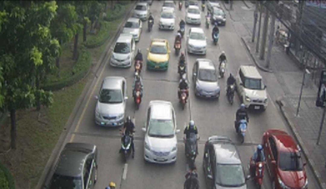 การจราจรถนนวิภาวดี-รังสิต ขาเข้า จากแยกสุทธิสาร มุ่งหน้าใต้ด้วนดินแดง ทั้งช่องด่วน และคู่ขนาน หนาแน่น เคลื่อนตัวได้ช้า