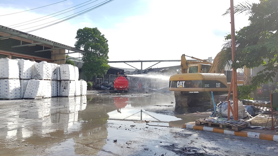 ความคืบหน้าเหตุเพลิงไหม้โกดังของโรงงานผลิตเสื่อน้ำมัน ย่านถนนเศรษฐกิจ 1 หมู่ 5 ต.นาดี อ.เมือง จ.สมุทรสาคร เมื่อคืนที่ผ่านมา (25 มิ.ย.) เจ้าหน้าที่ดับเพลิงต้องทำงานอย่างหนักเพื่อระงับเหตุมาเกือบ 20 ชั่วโมง ล่าสุด (26 มิ.ย.) เวลาประมาณ 15.00 น. เพลิงดับสนิทแล้ว หลังจากนำรถแบ็คโฮพลิกซากพลาสติกด้านบนที่ถูกเผาไหม้แล้วฉีดน้ำลงไปถึงด้านล่าง เพื่อไม่ให้ความร้อนสะสมเกิดปะทุได้อีก