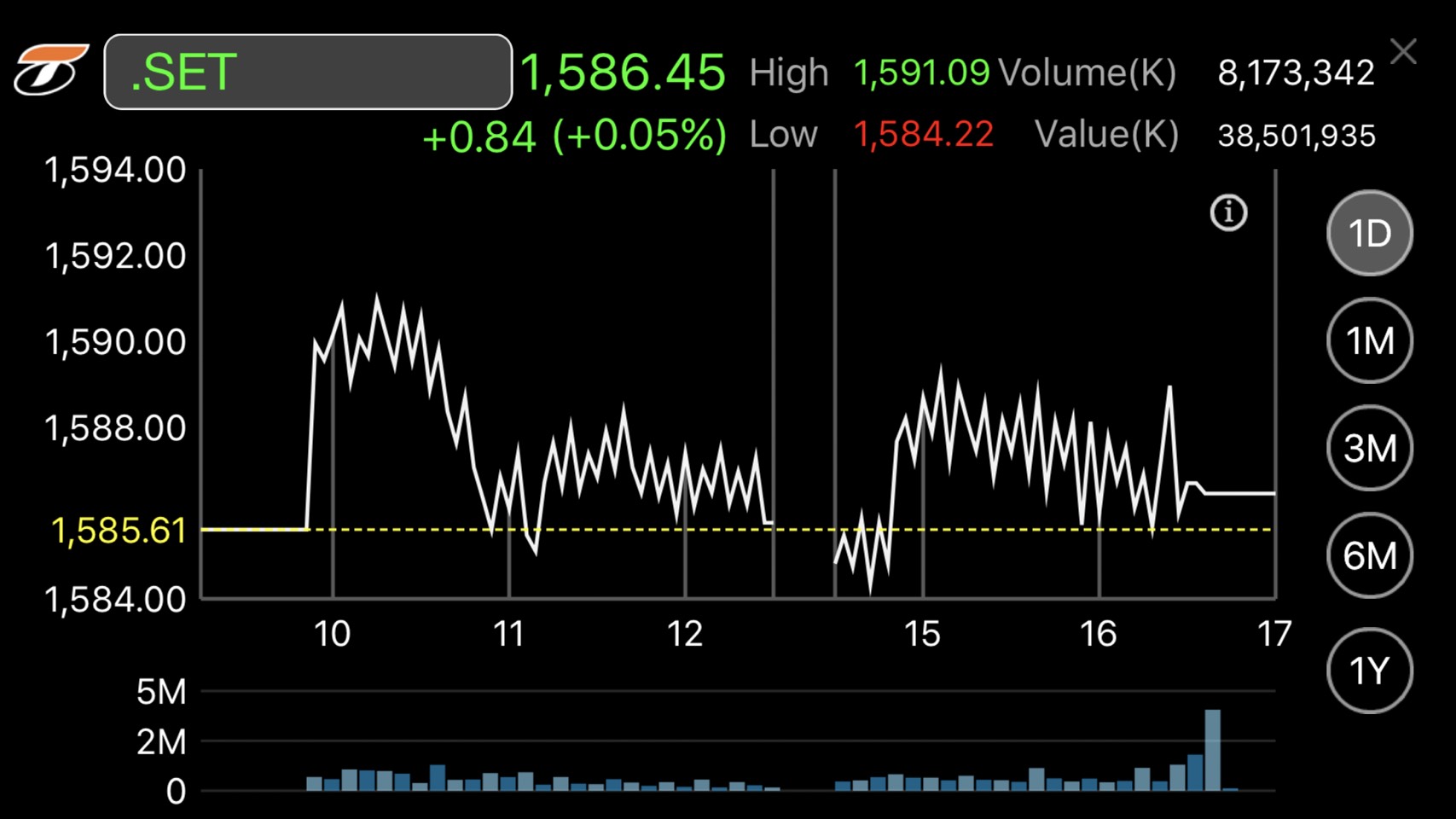 ผู้สื่อข่าวรายงานว่าดัชนีตลาดหลักทรัพย์ฯ ปิดที่ระดับ 1,586.45 จุด เพิ่มขึ้น 0.84 จุด มูลค่าการซื้อขาย 38,501.94 ล้านบาท การซื้อขายหุ้นวันนี้ดัชนีหุ้นไทยเคลื่อนไหวแดนบวกและลบ แตะจุดสูงสุดที่ระดับ 1,591.09 จุด และต่ำสุดที่ระดับ 1,584.22 จุด