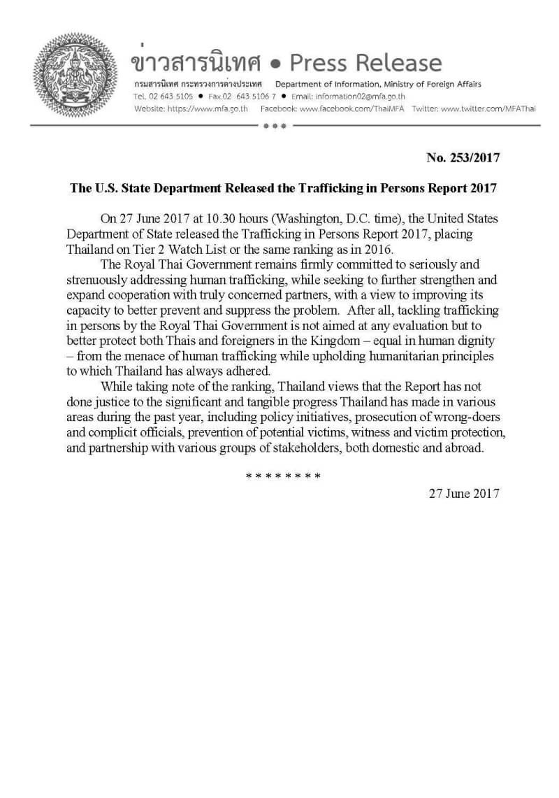 เว็บไซต์กระทรวงการต่างประเทศ เผยแพร่ข้อมูล เมื่อวันที่ 27 มิถุนายน 2560 เวลา 10.30 น. ตามเวลาท้องถิ่นกรุงวอชิงตัน ภายหลังที่กระทรวงการต่างประเทศสหรัฐอเมริกาได้เผยแพร่รายงานสถานการณ์การค้ามนุษย์ ประจำปี ค.ศ. 2017 ในปีนี้ ประเทศไทยได้รับการจัดสถานะให้อยู่ใน Tier 2 Watch List เช่นเดียวกับปี 2559