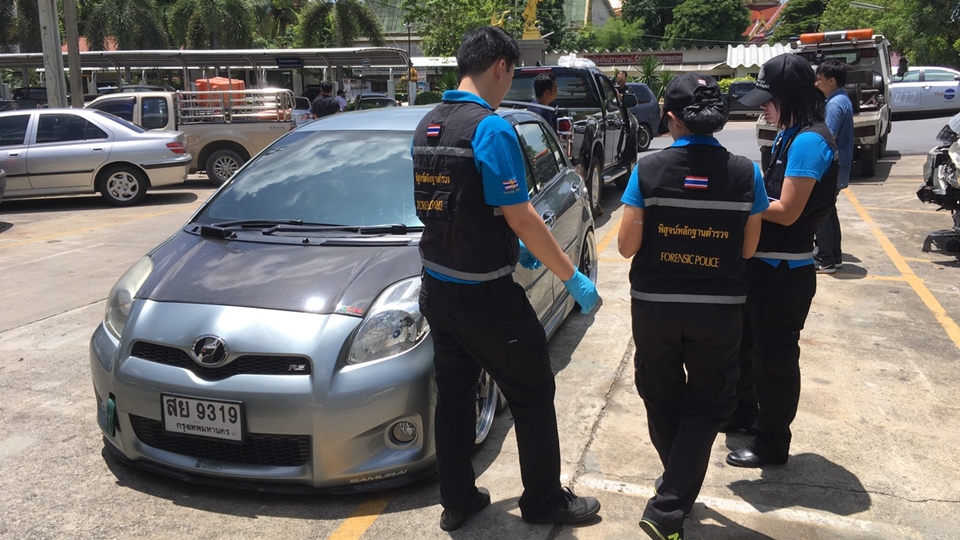 ตำรวจกองพิสูจน์หลักฐานเข้าตรวจสอบร่องรอยเฉี่ยวชนระหว่างรถกระบะกับรถยนต์โตโยต้ายาริส เพื่อพิสูจน์ข้อเท็จจริงกรณีสังคมออนไลน์แชร์คลิปเหตุการณ์จากกล้องหน้ารถ ขณะชายขับรถโตโยต้ายาริสลงจากรถพร้อมไม้เบสบอล เดินเข้ามาฟาดกระจกท้ายรถกระบะ คนขับรถกระบะจึงพยายามขับหนี ก่อนจะเกิดการขับไล่ตามชนจนรถกระบะไถลไปชนรถที่จอดข้างทาง เหตุเกิดบนถนนเลียบคลองสอง แขวงบางชัน เขตคลองสามวา เมื่อวันที่ 22 มิถุนายนที่ผ่านมา