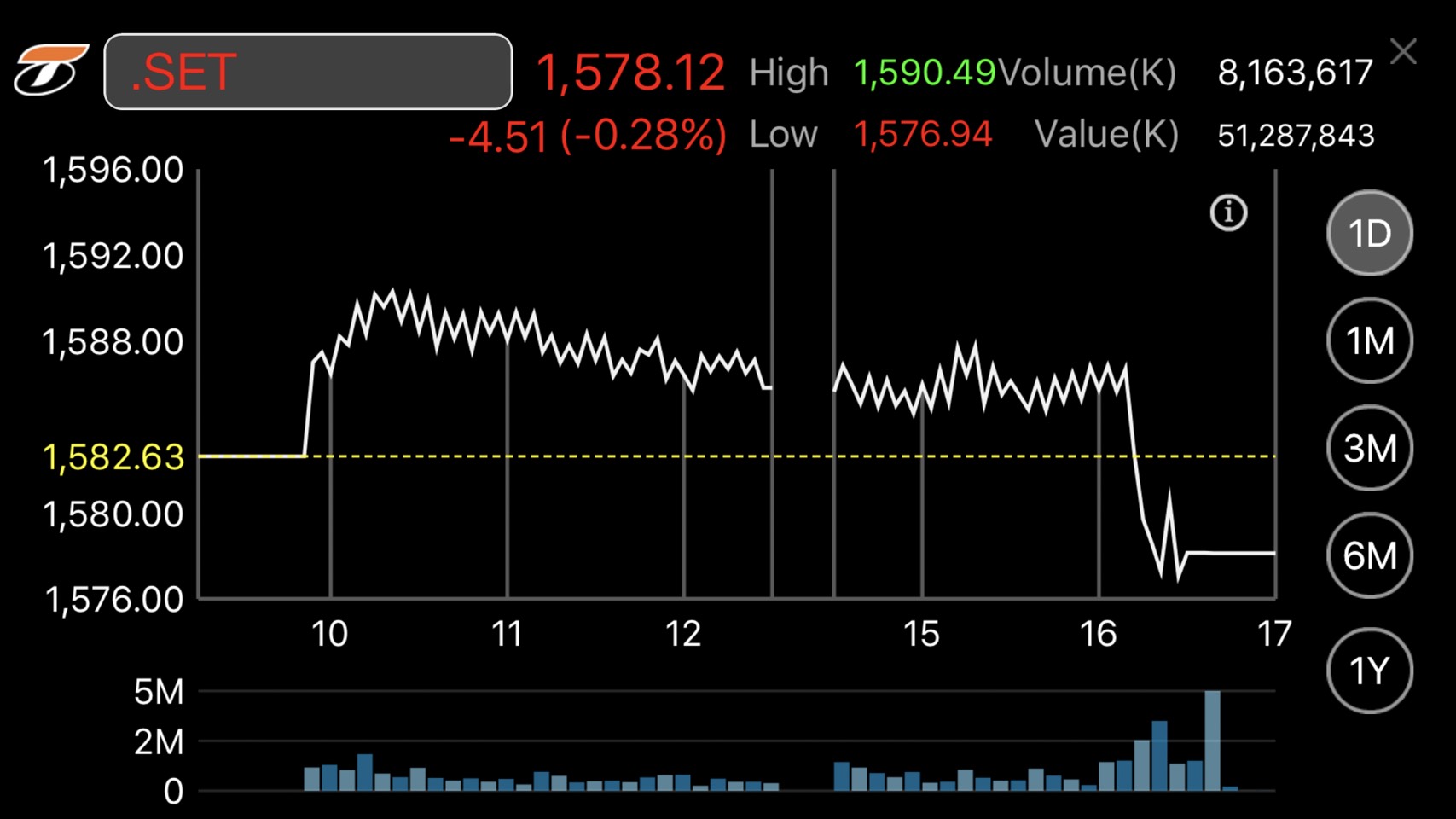 ผู้สื่อข่าวรายงานว่าดัชนีตลาดหลักทรัพย์ฯ ปิดที่ระดับ 1,578.12 จุด ลดลง 4.51 จุด หรือร้อยละ 0.28 มูลค่าการซื้อขาย 51,287.84ล้านบาท การซื้อขายหุ้นวันนี้ดัชนีเคลื่อนไหวทั้งแดนบวกและลบ โดยดัชนีฯแตะจุดสูงสุดที่ 1,590.49 จุด และต่ำสุดที่ระดับ 1,576.94 จุด