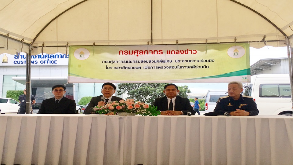 บรรยากาศภายในเขตปลอดอากร บางกอกฟรีเทรดโซน ย่านบางเสาธง จ.สมุทรปรากร นำโดยนายกุลิศ สมบัติศิริ อธิบดีกรมศุลกากร และพ.ต.ท.ปกรณ์ สุชีวกุล ผู้บัญชาการสำนักคดีการเงินการธนาคาร กรมสอบสวนคดีพิเศษ หรือดีเอสไอ พร้อมคณะทำงานร่วมกันแถลงความคืบหน้าการติดตามอายัดรถยนต์หรูที่ถูกโจรกรรมจากประเทศอังกฤษ โดยครั้งนี้สามารถตามนำรถเมอร์เซเดส-เบนซ์ จีแอลอี 350 D สีดำ และรถนิสสัน จีทีอา สีขาว ที่กำลังขนส่งออกไปยังฮ่องกง กลับมาไทยแล้ว
