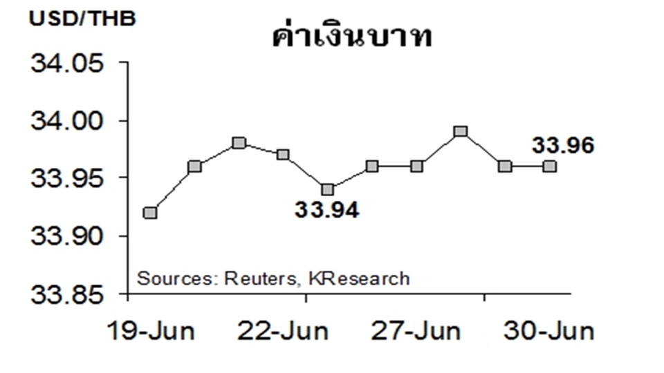 สำหรับสัปดาห์หน้า (3-7 ก.ค.) ธนาคารกสิกรไทยประเมินกรอบการเคลื่อนไหวเงินบาท 33.80-34.10 บาทต่อดอลลาร์สหรัฐ โดยจุดสนใจของตลาดในประเทศ น่าจะอยู่ที่ผลการประชุมคณะกรรมการนโยบายการเงิน (กนง.) ช่วงกลางสัปดาห์ ขณะที่ตัวเลขเศรษฐกิจสหรัฐสำคัญ ประกอบด้วย ดัชนี PMI ภาคการผลิตและภาคบริการ ตัวเลขการจ้างงานนอกภาคเกษตรเดือนมิถุนายน ยอดสั่งซื้อสินค้าภาคโรงงาน และรายจ่ายด้านการก่อสร้างเดือนพฤษภาคม นอกจากนี้ ตลาดน่าจะรอติดตามรายงานการประชุมเฟด รวมถึงดัชนี PMI ภาคการผลิตของหลายประเทศ อนึ่ง ตลาดการเงินสหรัฐจะปิดทำการวันที่ 4 กรกฎาคม เนื่องในวันชาติสหรัฐ