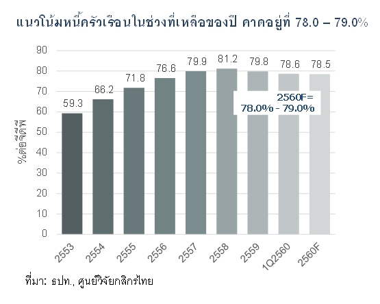 บริษัท ศูนย์วิจัยกสิกรไทย จำกัด รายงานว่าสัดส่วนหนี้ครัวเรือนต่อจีดีพีไตรมาส 1/2560 ปรับลดลงเป็นไตรมาสที่ 5 สู่ระดับร้อยละ 78.6 ต่อจีดีพี เทียบกับระดับร้อยละ 79.8 ต่อจีดีพี เมื่อสิ้นปี 2559 ทั้งนี้ สัดส่วนหนี้ครัวเรือนต่อจีดีพีที่ปรับลดลงเป็นผลมาจากฐานจีดีพีที่ขยายตัวสูงกว่าหนี้ และจากการชำระคืนหนี้ของครัวเรือนช่วงต้นปี ขณะที่ยอดคงค้างหนี้ครัวเรือนสิ้นไตรมาส 1/2560 ปรับเพิ่มขึ้นร้อยละ 3.1 สู่ระดับ 11.48 ล้านล้านบาท หรือเพิ่มขึ้น 1.16 หมื่นล้านบาทจากไตรมาสก่อนหน้า ดังนั้น ศูนย์วิจัยกสิกรไทยได้ปรับลดประมาณการสัดส่วนหนี้ครัวเรือนต่อจีดีพีลงสู่ระดับร้อยละ 78.0 – 79.0 (ค่ากลางที่ 78.5%) ตามอานิสงส์จากฐานจีดีพีที่สูงกว่าคาดการณ์เดิม และการชะลอตัวของสินเชื่อที่อยู่อาศัยและสินเชื่อเพื่อประกอบธุรกิจของครัวเรือนที่มากกว่าคาด
