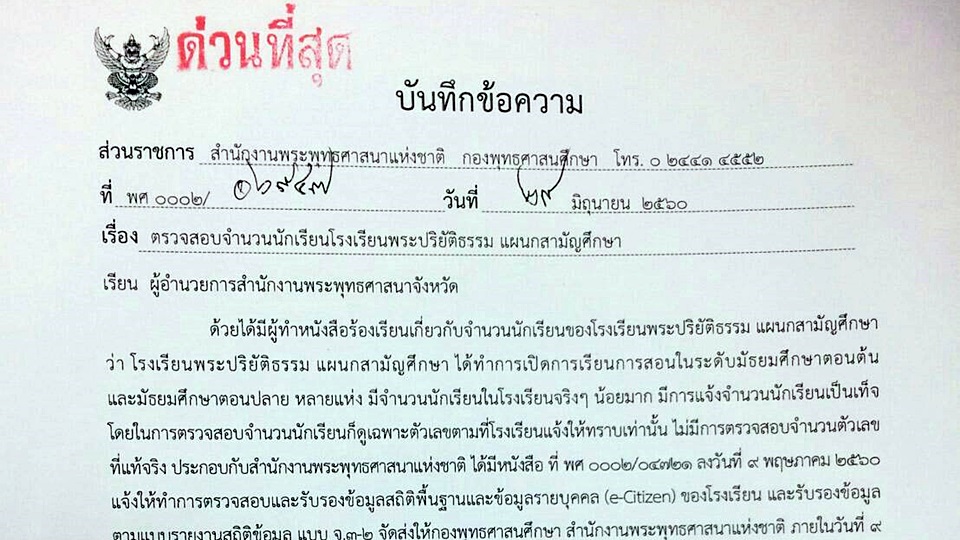 จึงได้ทำหนังสือแจ้งไปยังสำนักงานพระพุทธศาสนาจังหวัดทุกจังหวัด ลงพื้นที่ตรวจสอบจำนวนนักเรียนตามโรงเรียนพระปริยัติธรรมแผนกสามัญทั่วประเทศ แล้ว เพื่อให้การดำเนินการเกี่ยวกับการตรวจสอบจำนวนนักเรียนเป็นไปด้วยความเรียบร้อยและถูกต้องตามกฏหมายจึงขอให้สำนักงานพระพุทธศาสนาจังหวัดร่วมกับสำนักงานกลุ่มโรงเรียนพระปริยัติธรรม ลงพื้นที่ตรวจสอบข้อมูลจำนวนนักเรียนให้ถูกต้องและเป็นปัจจุบัน พร้อมให้รับรองข้อมูลมาตามแบบรายงานสถิติพื้นฐานและข้อมูลรายบุคคลของโรงเรียน และแบบรายงานสถิติข้อมูล ส่งให้กองพุทธศาสนศึกษาภายในวันที่ 6 กรกฎาคม 2560