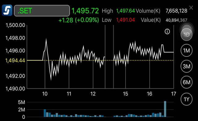 ตลท. 31 ต.ค. – ผู้สื่อข่าวรายงานว่าดัชนีตลาดหลักทรัพย์ปิดการซื้อขายวันนี้ที่ระดับ 1,495.72 จุด เพิ่มขึ้น 1.28 จุด หรือร้อยละ 0.09 มูลค่าการซื้อขาย 40,894.36 ล้านบาท โดยดัชนีเคลื่อนไหวแกว่งตัวอยู่ในช่วงแคบ ๆ ดัชนีสูงสุดของวันที่ระดับ 1,497.64 จุด และดัชนีต่ำสุดของวันที่ระดับ 1,491.84 จุด