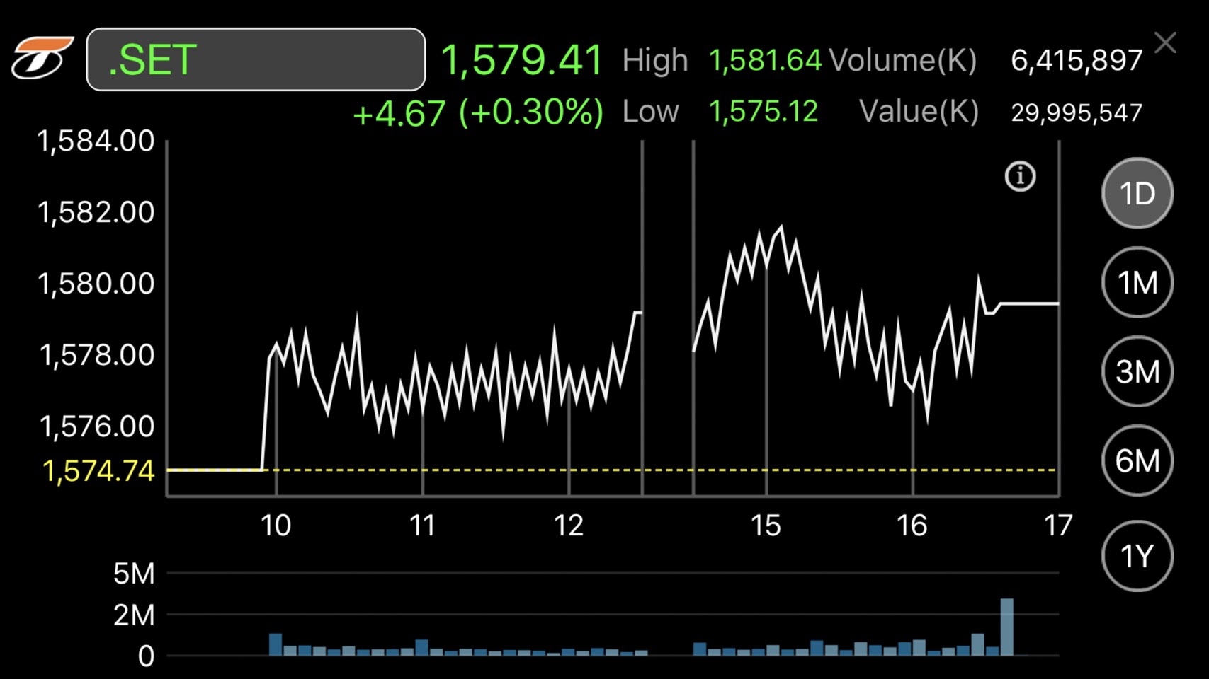 ผู้สื่อข่าวรายงานว่าดัชนีตลาดหลักทรัพย์ฯ ปิดที่ระดับ 1,579.41 จุด เพิ่มขึ้น 4.67 จุด (+0.30%) มูลค่าการซื้อขาย 29,995.55 ล้านบาท การซื้อขายหุ้นวันนี้ดัชนีเคลื่อนไหวนแดนบวกตลอดทั้งวัน โดยดัชนีฯ แตะจุดสูงสุดที่ 1,581.64 จุด และต่ำสุดที่ระดับ 1,575.12 จุด