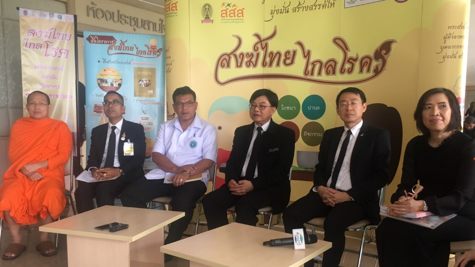 รศ.ดร.ภญ.จงจิตร อังคทะวานิช ผู้จัดการโครงการขับเคลื่อนสงฆ์ไทยไกลโรคเพื่อการดูแลโภชนาการพระสงฆ์ในระดับประเทศ (สสส.) พระราชวรมุนี รองอธิการบดีฝ่ายกิจการนิสิต มหาวิทยาลัยมหาจุฬาลงกรณราชวิทยาลัยและ นพ.ชาญวิทย์ วสันต์ธนารัตน์ ผู้อำนวยการสำนักสร้างเสริมสุขภาวะในองค์กร สสส. ร่วมกันแถลงข่าว สงฆ์ไทย ไกลโรค เข้าพรรษานี้ ตักบาตรอย่าลืมถามสุขภาพพระ