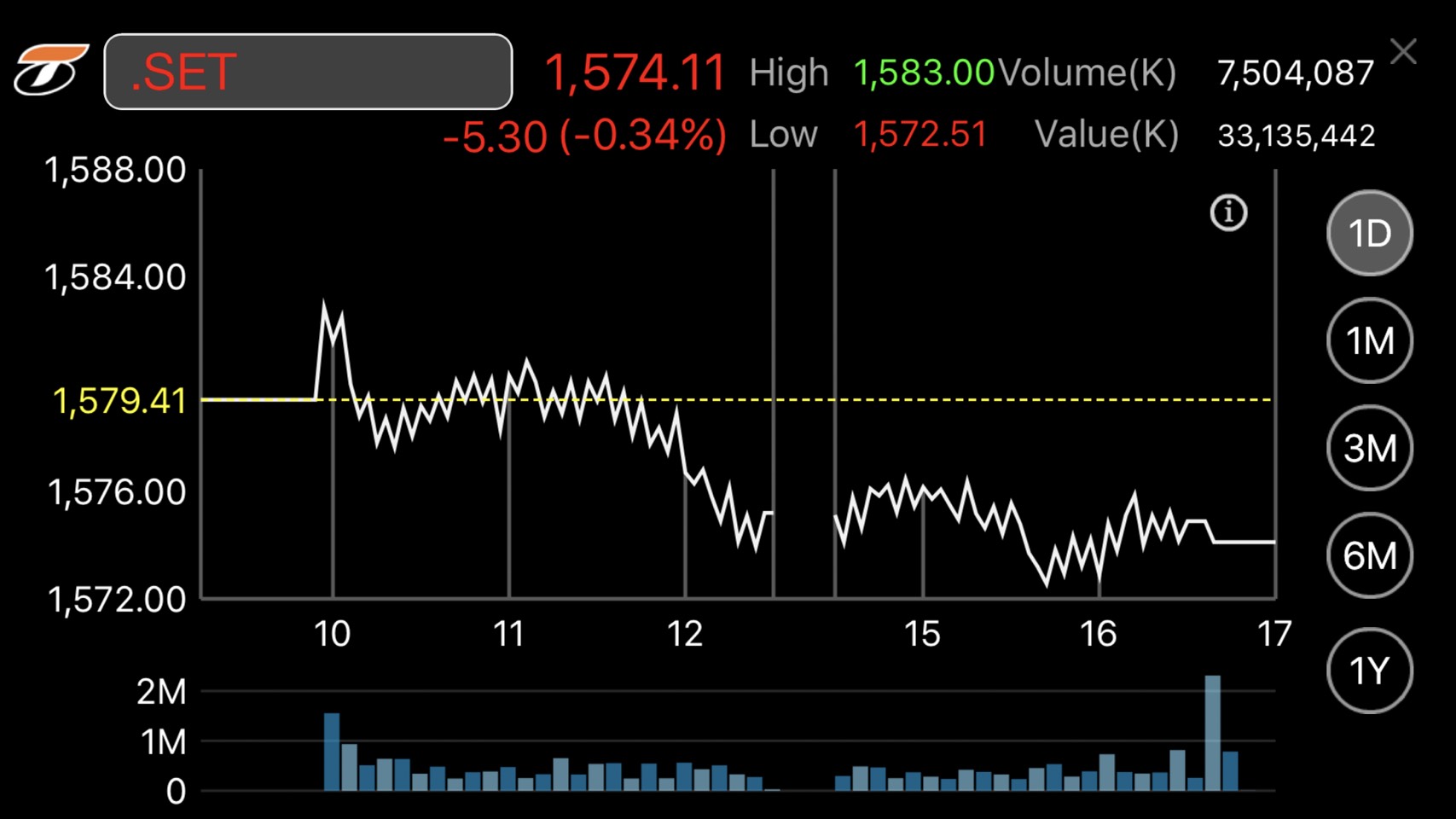ผู้สื่อข่าวรายงานว่าดัชนีตลาดหลักทรัพย์ฯ ปิดที่ระดับ 1,574.11 จุด ลดลง 5.30 จุด หรือร้อยละ 0.34 มูลค่าการซื้อขาย 33,135.44 ล้านบาท การซื้อขายหุ้นวันนี้ดัชนีเคลื่อนไหวแดนลบเป็นส่วนใหญ่ ดัชนีฯ แตะจุดสูงสุดที่ 1,583.00 จุด และต่ำสุดที่ระดับ 1,572.51 จุด
